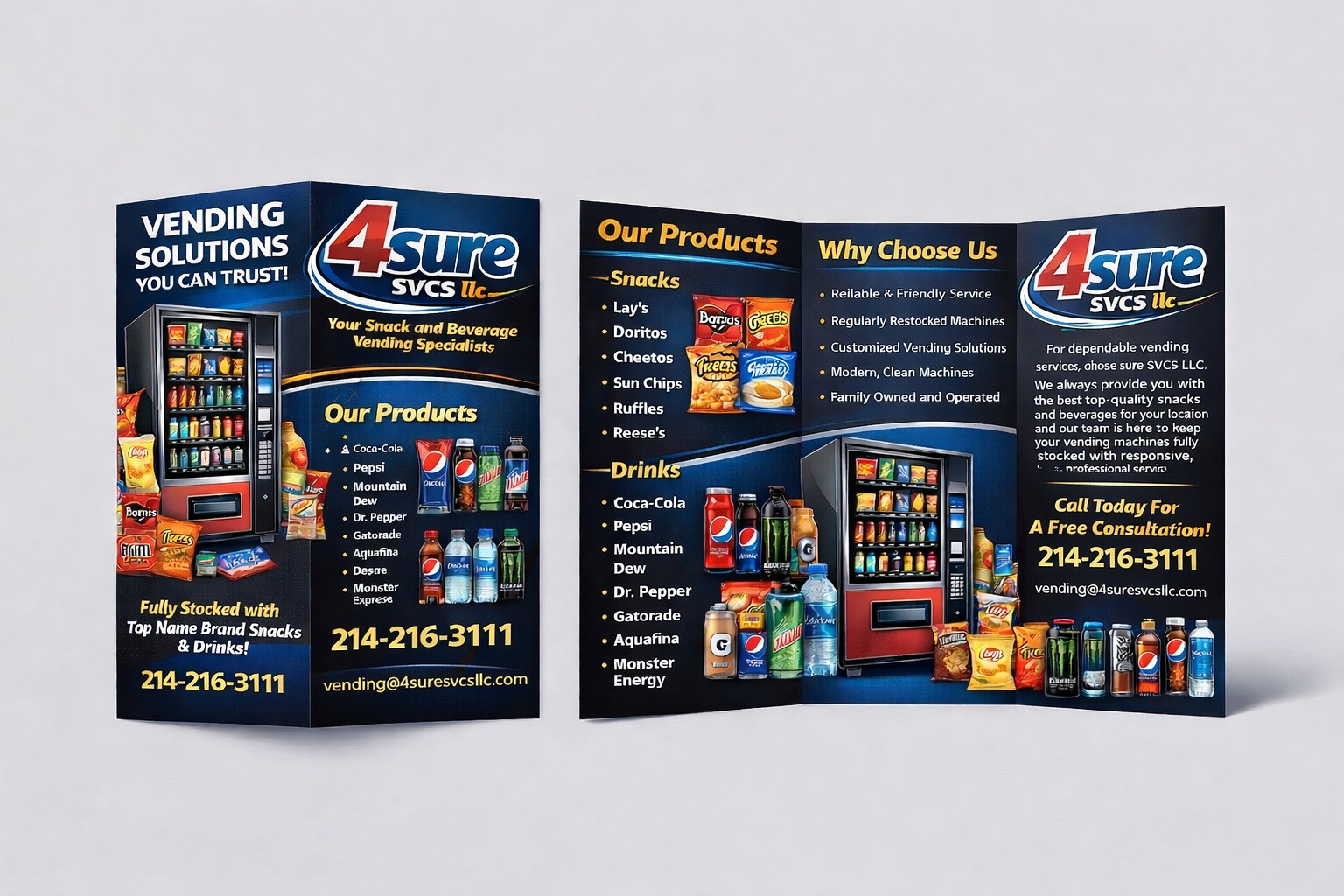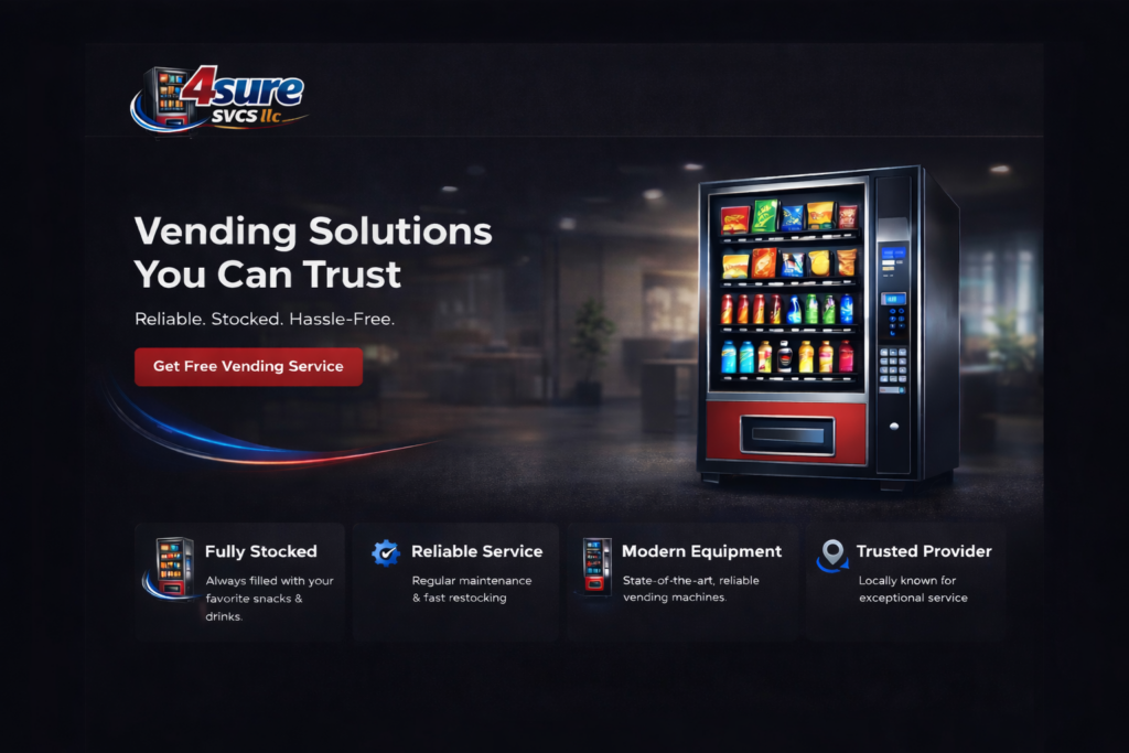 4Sure SVCS LLC is dedicated to providing reliable, hassle-free vending solutions that keep businesses, employees, and customers satisfied. Our mission is to deliver modern equipment and fully stocked machines with dependable service that you can count on. We understand that quality vending is essential to workplace satisfaction and employee morale.